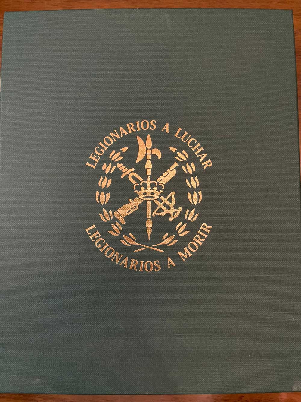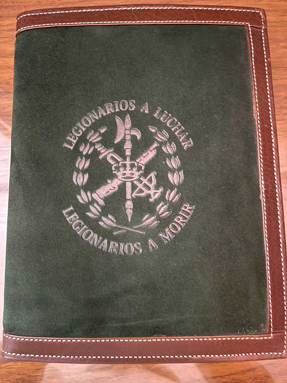 AGENDA DE LUJO CON TAPAS DE CUERO Y TERCIOPELO EN VERDE SARGA Y ESCUDO DE LA LEGIÓN GRABADO A LASER,